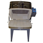 The GF3ETLC’s square design expands the firing space provided by traditional cylindrical glass kilns and with its unique top and clamshell loading feature, you get two kilns in one! Flash venting, glass raking, and loading shelves with glass positioned are easy and convenient with the clamshell loading feature. The model has an element in the lid of the kiln to provide radiant heat needed when the fusing temperature is reached and elements in the kiln walls for conductive heat. Elements in the firing chamber are used to evenly heat the glass piece and the lid element is used when the fusing temperature is reached. Models have a maximum temperature range of 1700°F to protect the optional quartz glass viewing window but can be reprogrammed to fire to higher temperatures.