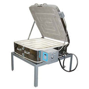 The GF5ETLC’s square design expands the firing space provided by traditional cylindrical glass kilns and with its unique top and clamshell loading feature, you get two kilns in one! Flash venting, glass raking, and loading shelves with glass positioned is easy and convenient with the clamshell loading feature. The model has an element in the lid of the kiln to provide radiant heat needed when the fusing temperature is reached and elements in the kiln walls for conductive heat. Elements in the firing chamber are used to evenly heat the glass piece and the lid element is used when the fusing temperature is reached. Models have a maximum temperature range of 1700°F to protect the optional quartz glass viewing window but can be reprogrammed to fire to higher temperatures. Glass kiln models 20” wide or larger are equipped with a lid lift assist for easy opening and closing of the kiln lid.